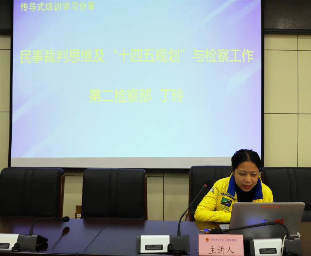 第二检察部副主任丁玲的讲述从民事裁判思维、“十四五”规划与检察工作发展两个方面进行展开。讲述以婚姻案例引入,提出争议点,引导大家运用民事裁判思维充分思考定案需要的法条、文义、体系和目的,并在民法典寻求答案。接着从宏观的角度出发,号召大家要贯彻落“讲政治、顾大局、谋发展、重自强”工作要求,坚持以人民为中心,拓宽监督渠道,及时总结工作经验,切实做好基层民事检察工作。