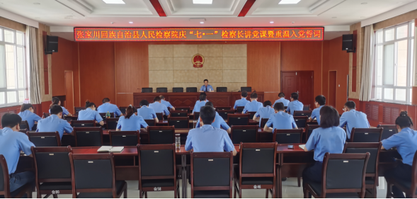 为庆祝中国共产党成立101周年,进一步深化党史学习教育成效,巩固政法队伍教育整顿成果,抓好“质量建设年”活动,2022年7月1日,张家川回族自治县约彩365软件官方下载_365bet最新备用网站_365速发登录入口党组书记、检察长彭爱铭为全体党员干警上了一堂题为《甘肃省第十四次党代会会议精神解读》的专题党课,深入解读省党代会精神,进一步引导全院党员干警树立正确党史观,持续增强做好检察工作的信心,激发干事创业精气神。
