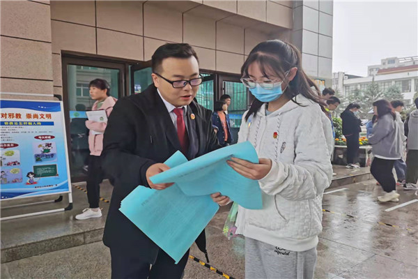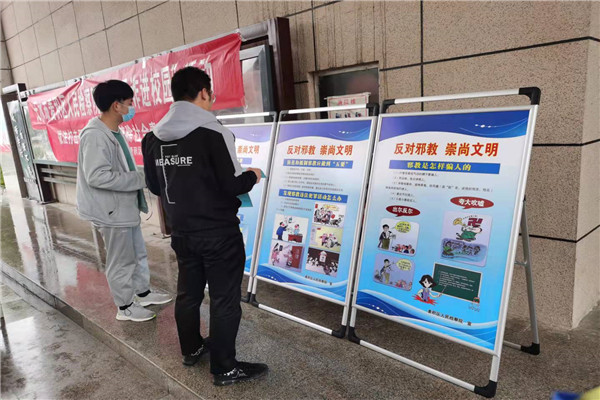 为引导广大高校师生牢固树立社会主义核心价值观,形成崇尚科学、反对迷信、抵制邪教、健康成长的思想理念;加深高校师生对邪教特征和危害的认识,提升广大师生识别和抵御邪教的意识和能力,净化校园环境。10月13日,我院干警深入甘肃省林业职业技术学院开展反邪教宣传活动。