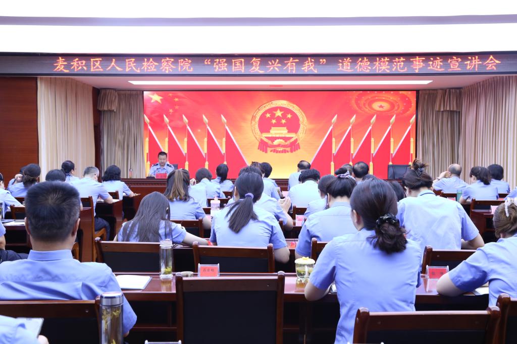 为深入贯彻《新时代公民道德建设实施纲要》,充分发挥道德模范、身边好人等先进模范示范引领作用。8月15日,麦积区约彩365软件官方下载_365bet最新备用网站_365速发登录入口举办了以“强国复兴有我”为主题的道德模范宣讲报告会,邀请第六届天水市道德模范赵卫强同志进行宣讲,会议由党组成员、政治部主任杜丰主持,全体干警参会。