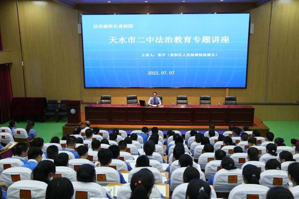 “习近平总书记要求我们青年人要'扣好人生第一粒扣子’,强调的就是要从小树立起一个规矩意识、法治思维…”7月7日下午,麦积区检察院党组书记、检察长、天水市二中法治副校长张宇应邀为天水市二中全校师生进行法治宣讲。