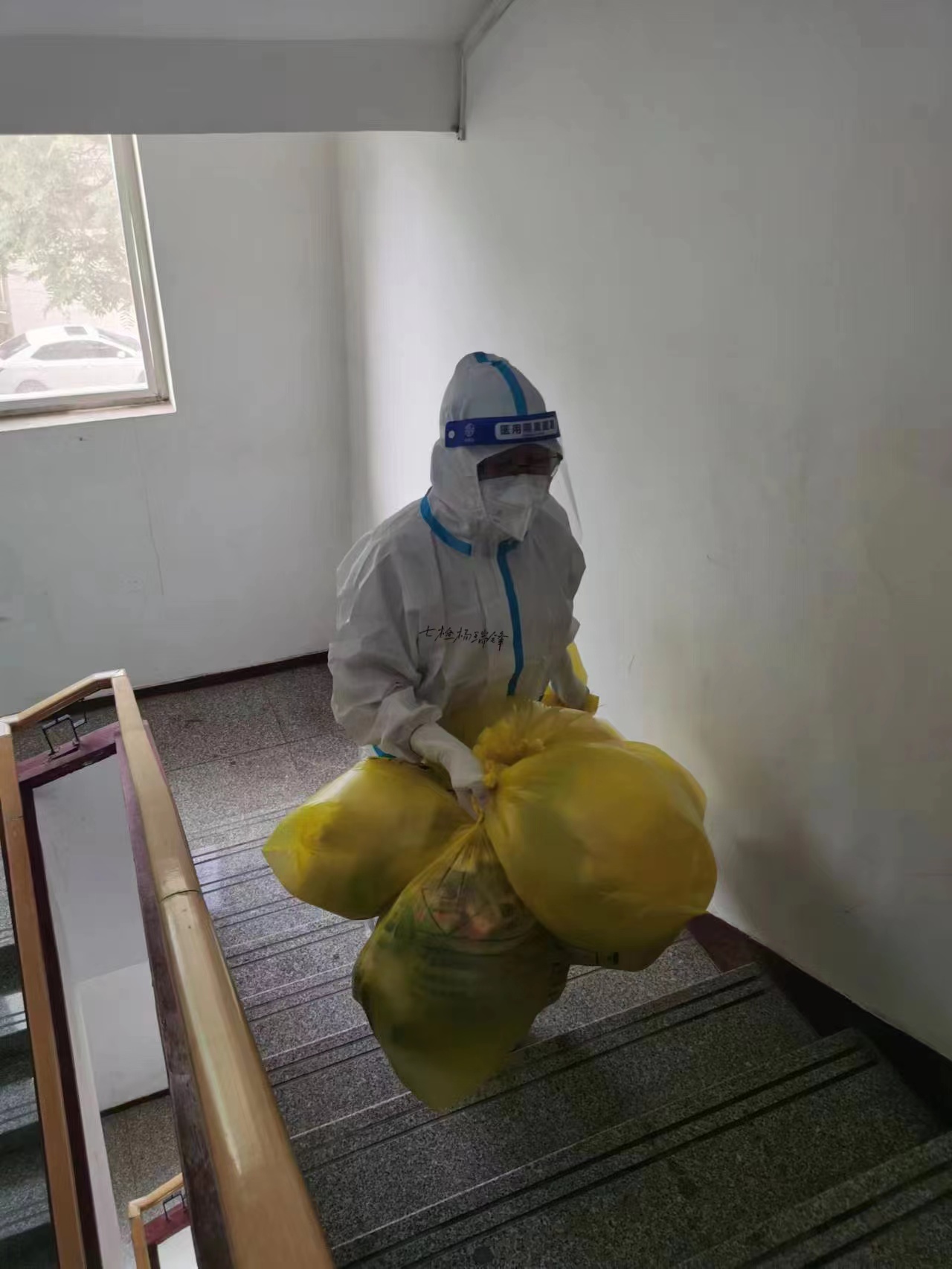 作为七里河区检察院进驻隔离酒店的内点位长石焱,不仅统筹团队、协调隔离点各项防疫任务,还化身心理疏导家,耐心劝导,使大家从刚进入隔离点时害怕被确诊的忧虑和与家人分离的烦躁中走出来。杨瑞锋、贾珺、张德志每天身背重约50斤的雾化机械,手提上百人的一日三餐、紧急物品和生活用品,清运多达300至400斤的医疗垃圾,从清晨到黄昏,从深夜到凌晨,已经不记得穿过酒店走廊多少次,不记得收取医废垃圾多少次,不记得防护服里衣服和头发湿了多少次。隔离点有老人、孩子、孕妇、哺乳期妈妈及患有高血压、糖尿病等基础疾病的人员,张佳丽每天要对着手机详细询问并记录他们的健康状况和生活需求。同时,还要做好隔离人员每天的增减、隔离点房源安排和人员异动报备、体温监测、核酸检测等等数据信息的统计报送与台账整理,一天只有3-4个小时的休息时间已是常事,有时候累的靠在椅子上就能睡着,看似填报的这一串串数字很普通,却对整个疫情防控有序开展起着特殊的作用。