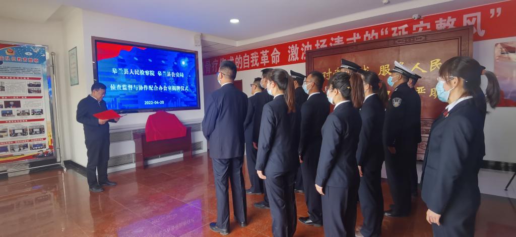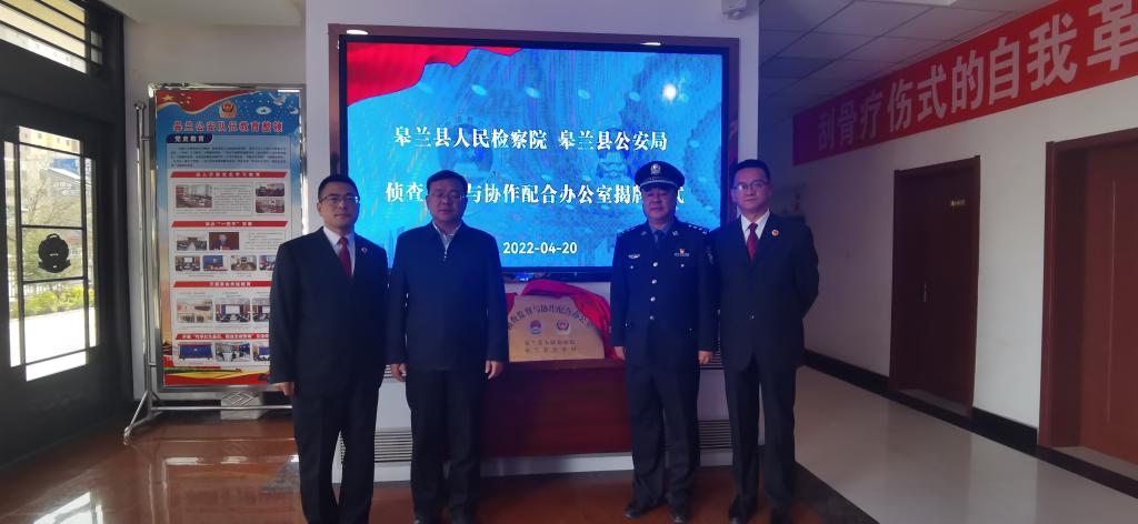 2022年4月20日,皋兰县人民检察院、皋兰县公安局共同举行“侦查监督与协作配合办公室”揭牌仪式。皋兰县委常委、政法委书记颜维祥,县政府副县长、县公安局党委书记、局长赵志军,县检察院党组书记、检察长娄成龙,县公安局政委魏孔泉,县检察院副检察长陈永忠及相关职能部门负责人参加揭牌仪式。
