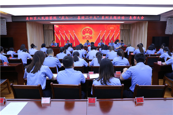 6月30日上午,伴随着庄严的国歌声,麦积区约彩365软件官方下载_365bet最新备用网站_365速发登录入口“庆七一·喜迎二十大”系列主题活动暨优秀党员、优秀党务工作者表彰大会在院七楼会议室隆重召开,会议由党组成员、政治部主任杜丰主持,党组书记、检察长张宇出席会议并讲话,全院干警90余人参加了表彰大会。