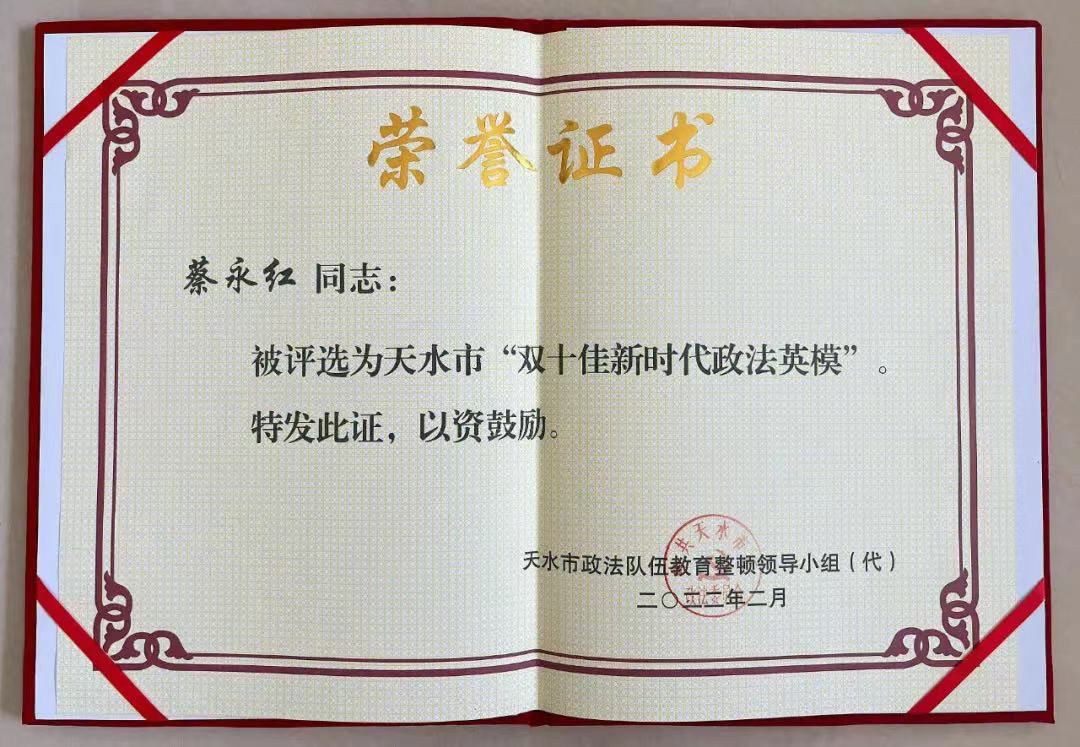 多年工作中,蔡永红始终以自己的实际行动抒写着一名基层检察干警“不忘初心、牢记使命”的政治本色,切实履行着党和人民赋予的职责使命。他始终坚定理想信念,不断增强“四个意识”,坚定“四个自信”,做到“两个维护”,旗帜鲜明讲政治,夯实廉洁从检思想基础。“初心、担当、责任”,这是他办案时践行的理念。他始终将“以人民为中心”的司法理念渗透在每一个办案过程中。他深知:每一个案件都是一份责任,都要对得起这份责任。正是心中装着这份责任,对待弱者,因他的温柔而使法律美丽,对待犯罪者,因他的无私无畏而彰显法律的尊严和正义,对待人民群众,因他心中装着人民而备受赞誉。