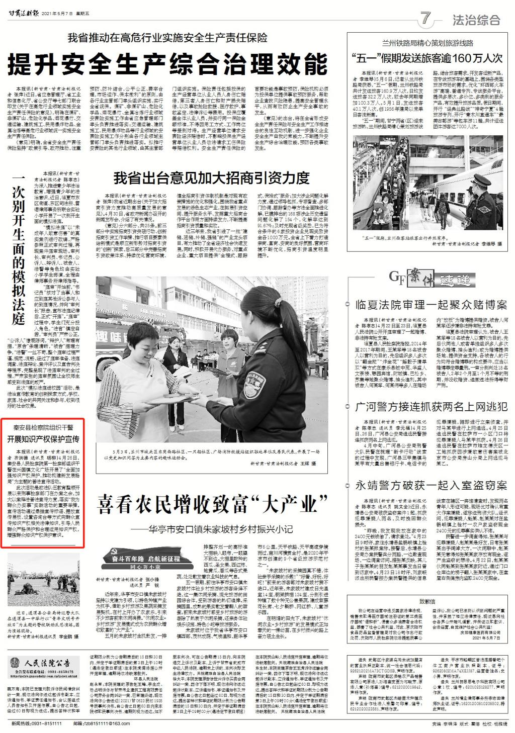 2021年5月7日甘肃法制报7版刊发《秦安县检察院组织干警开展知识产权保护宣传》