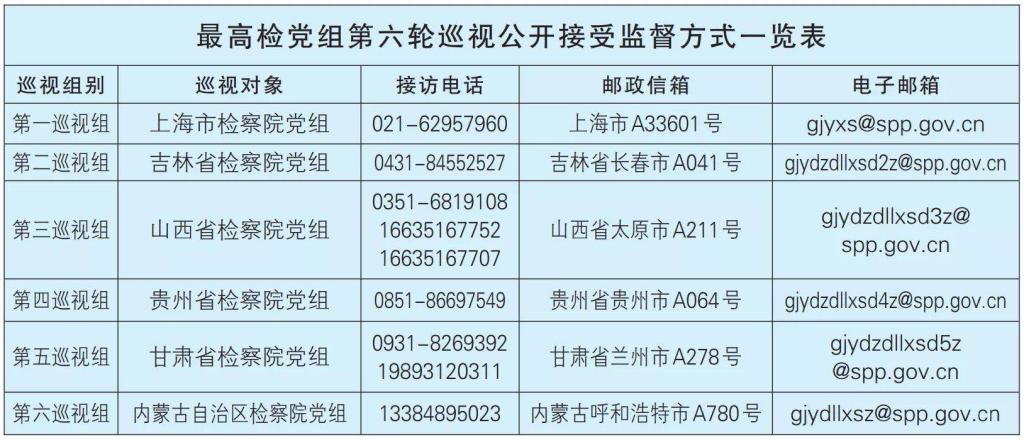 按照最高检党组第六轮巡视工作统一部署,最高检党组于10月19日至12月19日,对上海、吉林、山西、贵州、甘肃5个省级院党组开展常规巡视,组织1个巡视组对内蒙古自治区检察院党组进行巡视“回头看”。10月19日至21日,最高检党组6个巡视组陆续召开巡视进驻动员会。